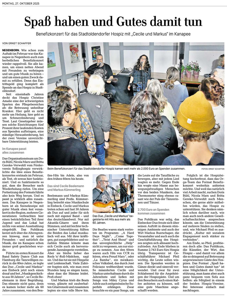Cecile Beelmann und Marcus Kümmerling rockten in früheren Zeiten bereits als Bandkollegen die Bühnen im In- und Ausland mit der Band Chair-o-plane in ihrer Ur-Besetzung. Gemeinsam präsentieren sie jetzt ein abendfüllendes Programm. Mit Akustik- und E-Gitarre sowie mehrstimmigen Gesängen spielen sie bekannte Songs von Künstlern wie Alanis Morrisette, CCR, AC/DC, Tracy Chapman, Cindy Lauper, Melissa Etheridge, The Eagles, Barclay James Harvest, John Denver, Black Crowes, Cat Stevens, The Beatles, Men at work, Adele, Bon Jovi, Ike & Tina Turner, Amy Winehouse, George Michael, Sheryl Crow, Michael Jackson und vielen anderen.